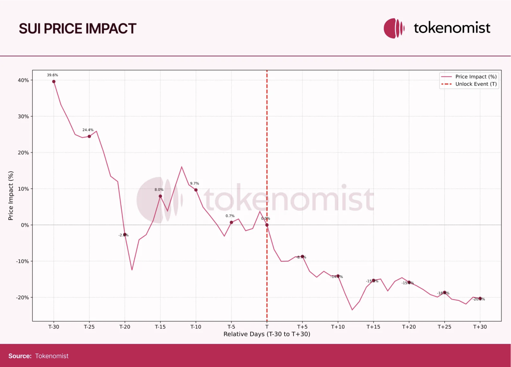 分析价格影响,SUI的价格在解锁前30天上涨了39.6%,但在解锁后30天内下跌了20.3%。