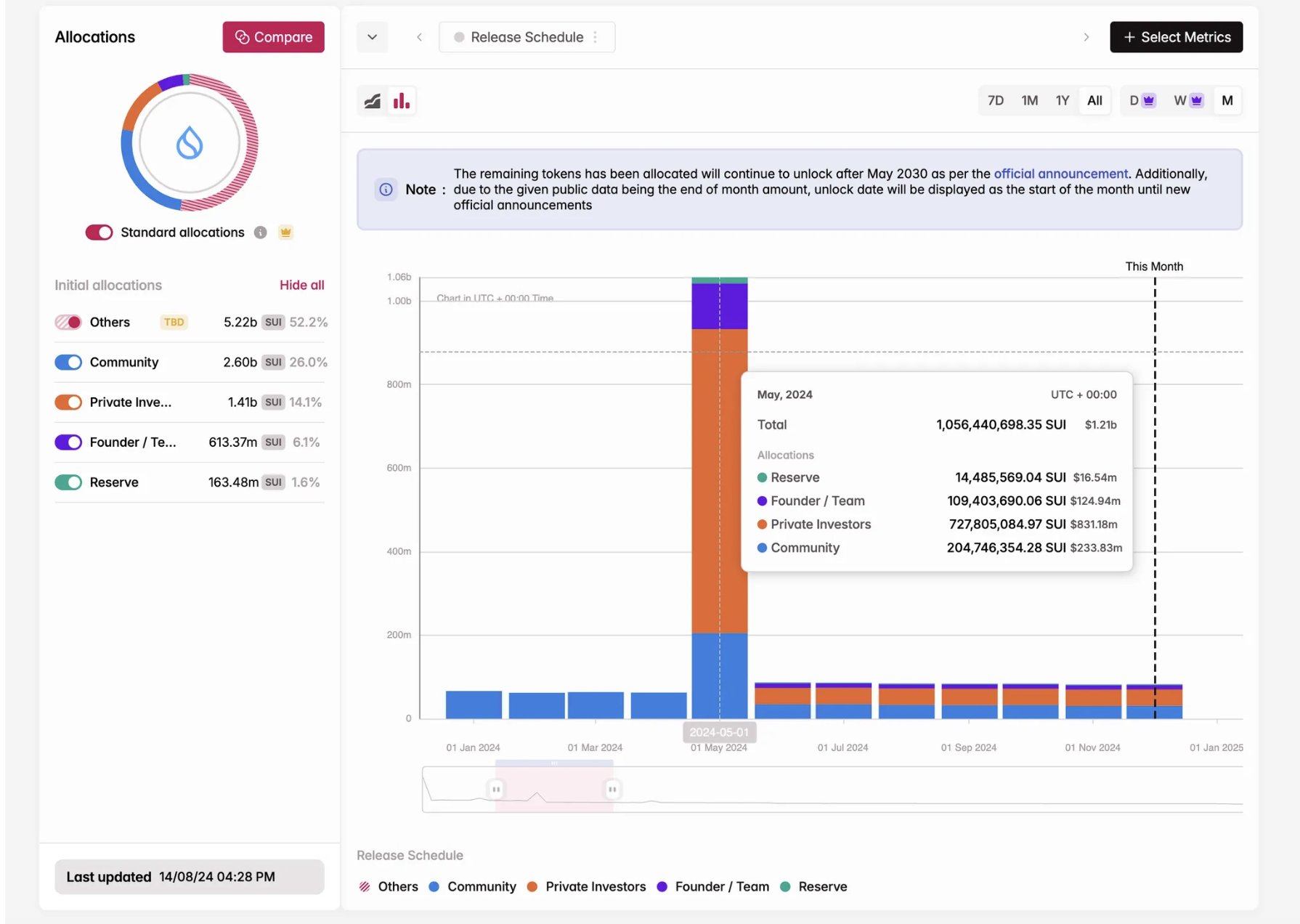2024年5月,Sui (SUI) 是年度第二大解锁事件,解锁价值为12.1亿美元。此次解锁释放了大量代币供应,且大部分分配给私人投资者。