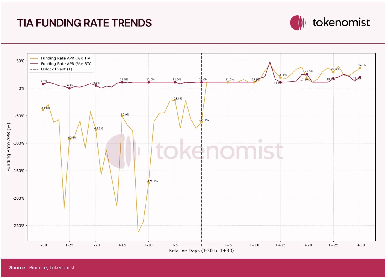 TIA的资金费率图表比其他代币更为波动。在解锁当天,TIA的资金费率保持在负值区域(-61.1%),但解锁后几天便恢复为正值,迅速与BTC的资金费率保持一致。
