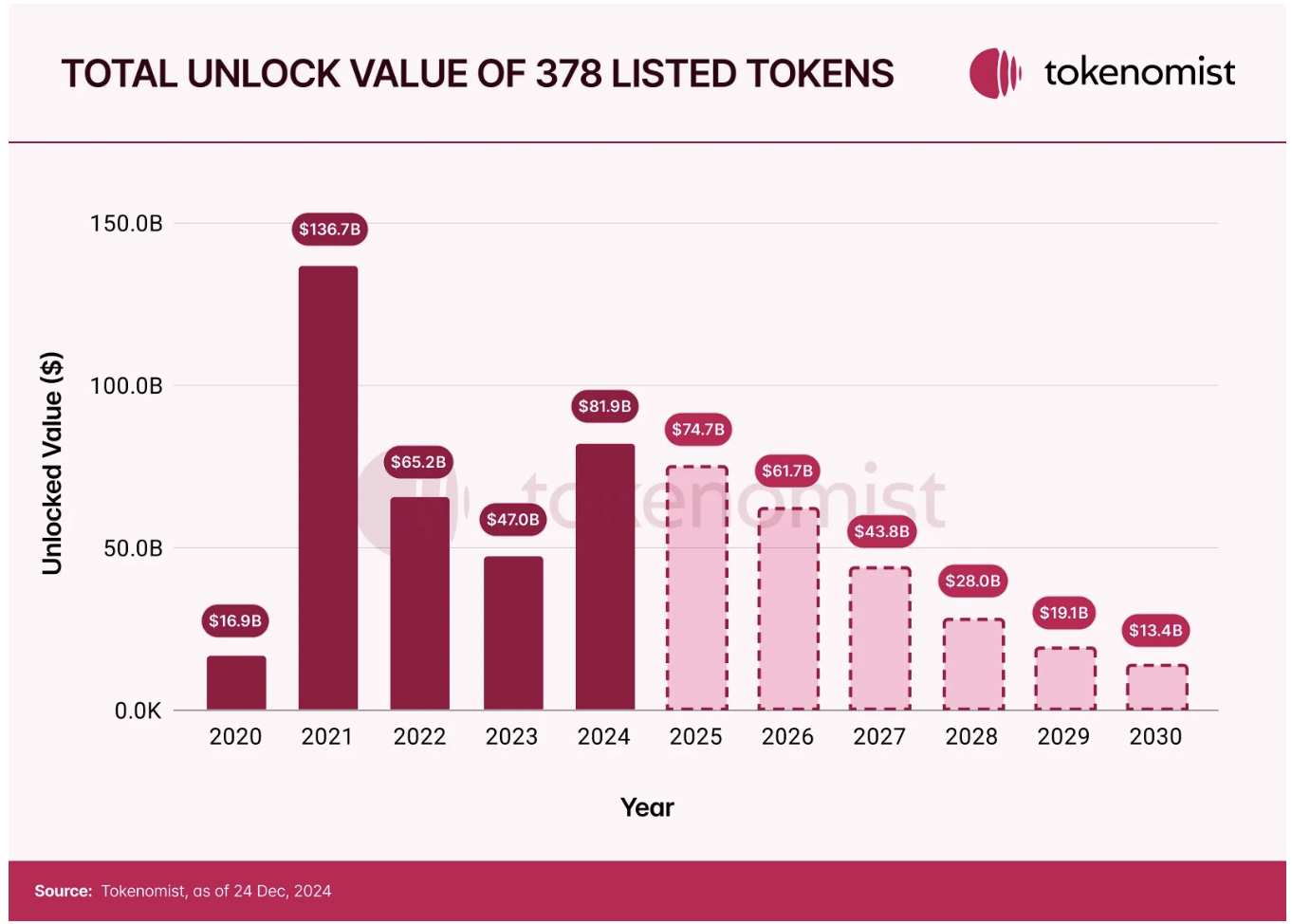 下面的图表显示了从2020年到2030年的代币解锁总价值,揭示了过去两个牛市周期中的一些显著模式。总解锁价值在2021年达到了1367亿美元的峰值,是2020年(169亿美元)的八倍多。虽然增幅没有那么大,但2024年的总解锁价值(820亿美元)大约是前一年的两倍(470亿美元)。这一峰值与上一个牛市的高峰相吻合,当时许多项目发行时锁定了大量的代币分配以供未来释放。