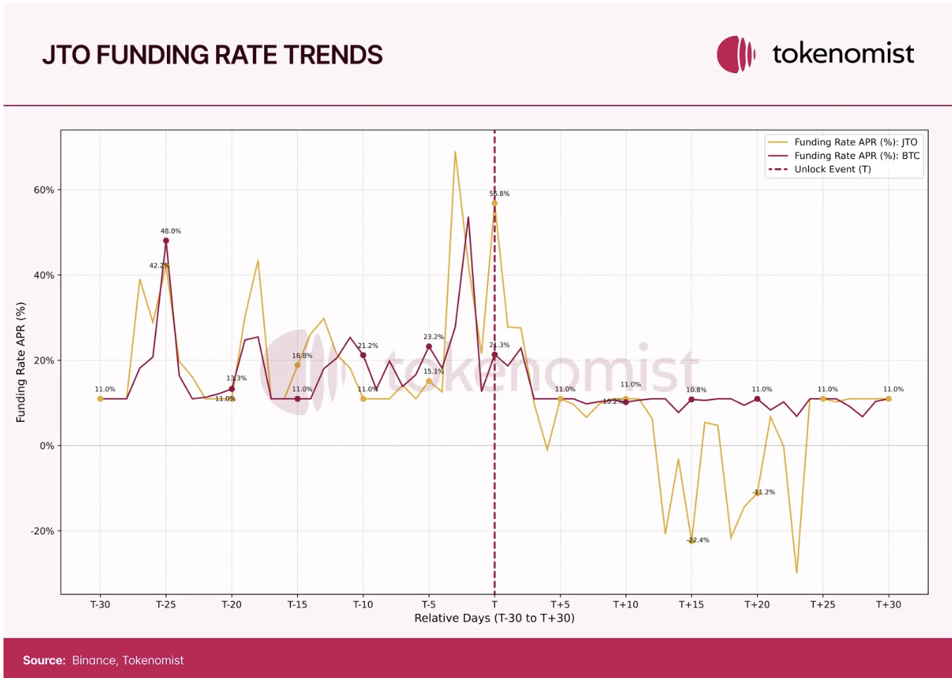 资金费率趋势也反映了这种波动性。在解锁前30天,JTO的资金费率大致与BTC相匹配,有时超过它,有时低于它。然而,在解锁后的30天内,我们可以观察到JTO的资金费率持续波动,而BTC保持相对平静。