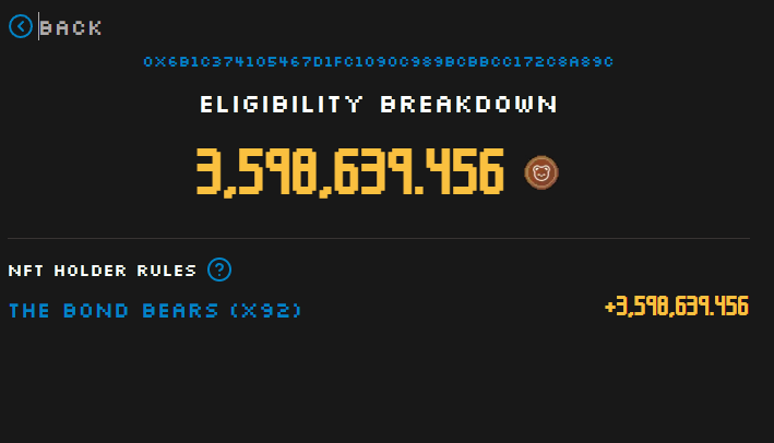 根据PANews调查发现,单个分配最多的NFT系列是Bong Bears NFT,每个NFT可获得48797枚代币,最高价值约为75.6万美元。The Bond Bears次之,也能分得39115枚代币,金额约为60.6万美元。