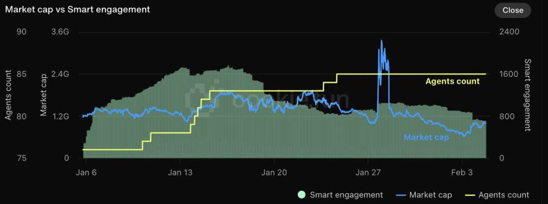 过去两周,DeFAI 的市值相较于 1 月中旬下跌了超 50%,相较于 1 月下旬的峰值更是下跌了 70%。数据来源于 @cookiedotfun。