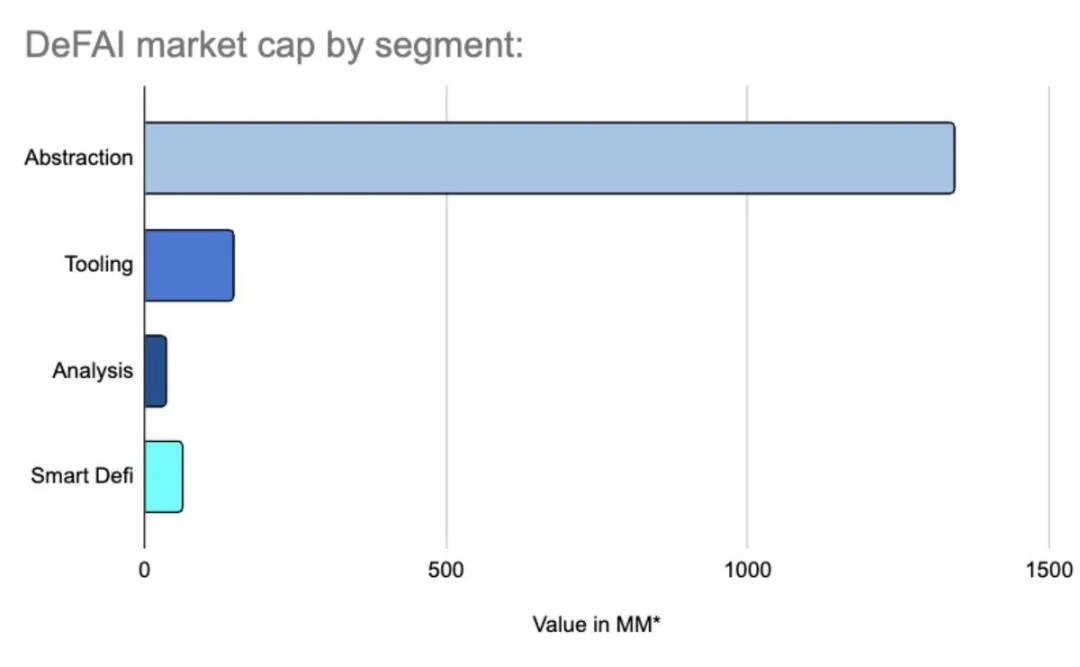 大多数 DeFAI 市场价值都集中在 「抽象化」 类别中。抽象化大多是基于文本的替代性用户体验(UX)。这个类别是 「低垂的果实」,因为它利用了现有的 DeFi 项目和大语言模型(LLM)的应用程序编程接口(API),它逻辑有限,主要是基于意图。鉴于这个领域目前的项目数量和估值,很可能赢家已经出现,与其他类别相比,我认为这里的机会有限。