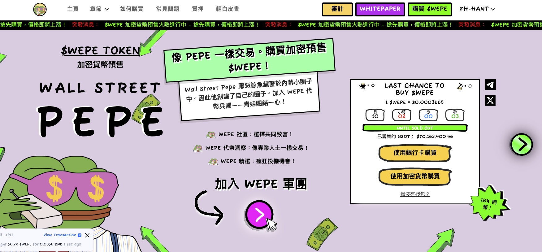 $WEPE仍在预售阶段,在预售结束后再上市DEX及CEX,建议投资者可进入官方网站、X及Telegram了解预售最新资讯。