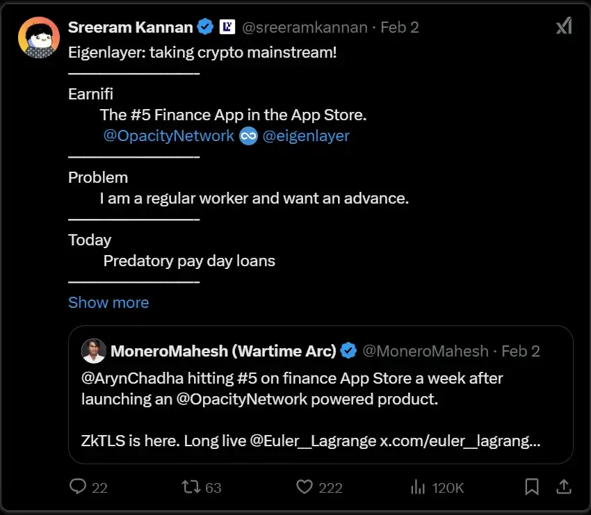 使用案例—工资提前获取 Earnifi 是一款据报道在应用商店排名中攀升到顶端,特别是在金融类应用中,利用了 OpacityNetwork 的 zkTLS。