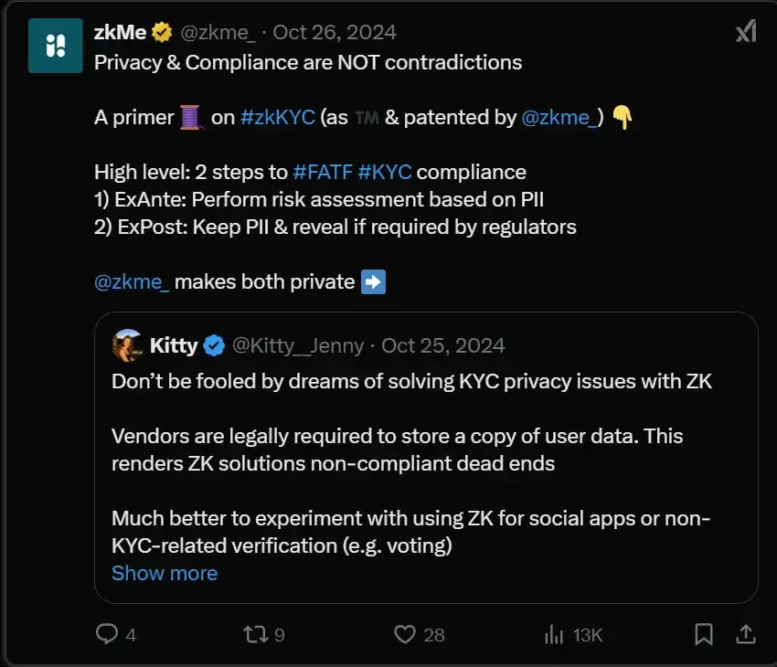 zkMe 的 zkKYC 解决方案应对了以隐私保护方式进行 KYC(了解你的客户)流程的挑战。通过利用零知识证明,zkKYC 使平台能够验证用户身份而不暴露敏感的个人信息,从而在维护合规性的同时保护用户隐私。