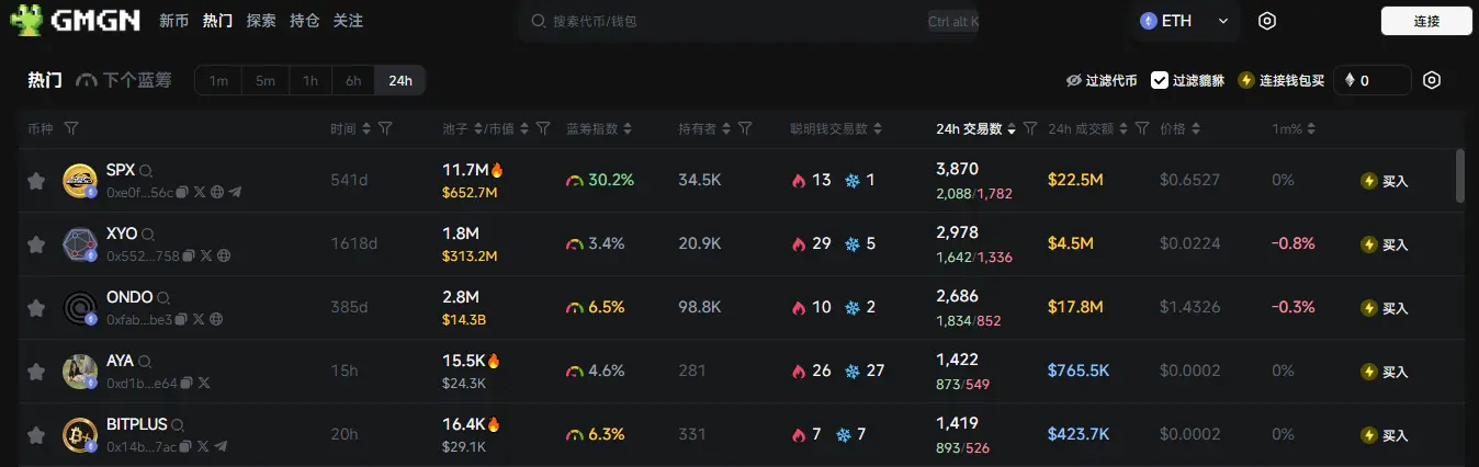 过去 24h 以太坊热门代币前五依次为:SPX、XYO 、 ONDO、AYA、BITPLUS