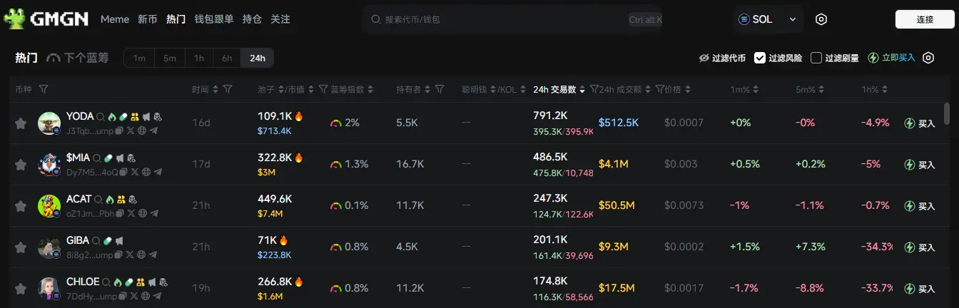 过去 24h Solana 热门代币前五依次为:YODA 、$MIA 、ACAT、GIBA 、CHLOE