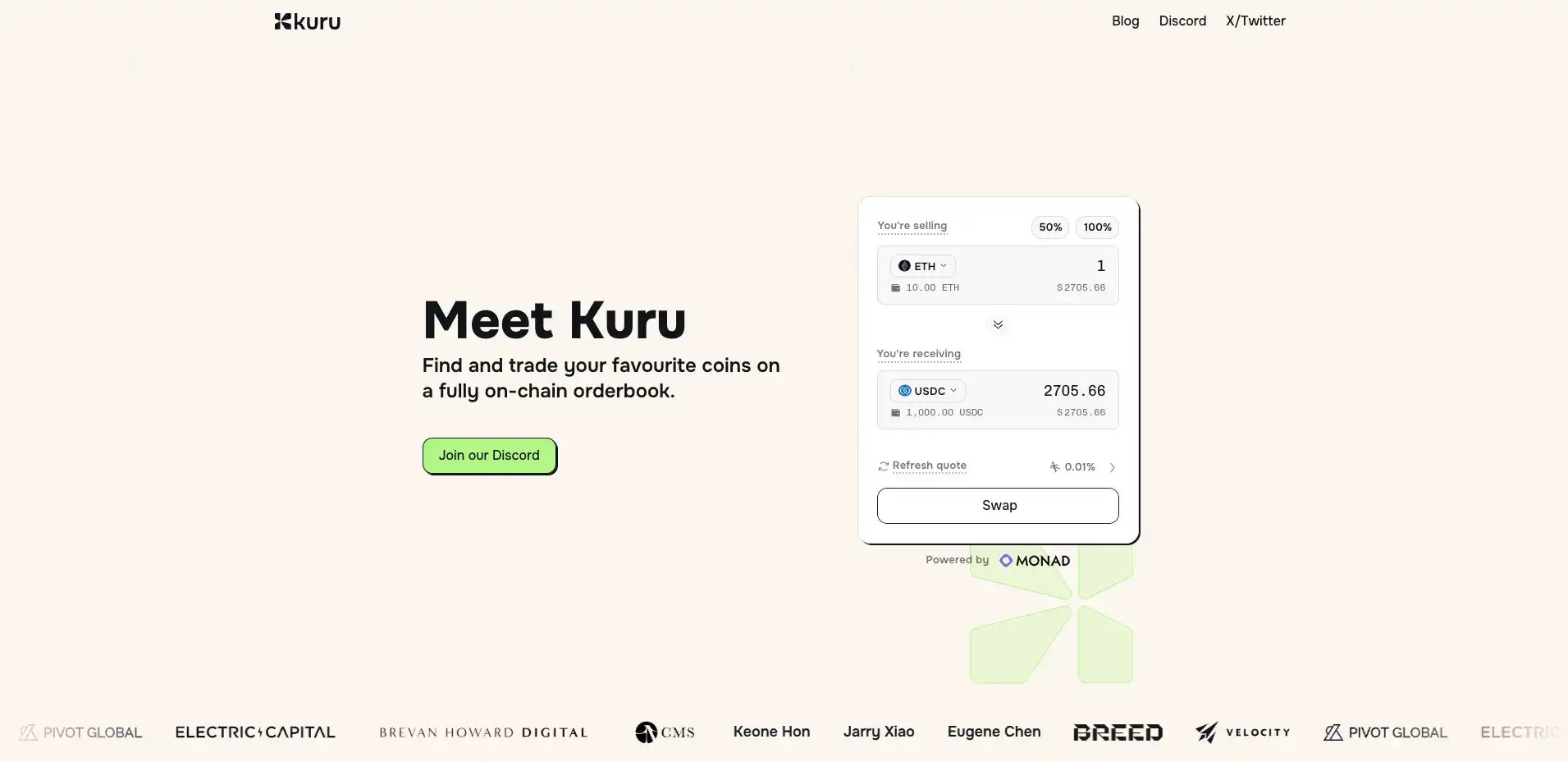 Kuru 是一个完全链上订单簿平台,去年 7 月完成了 200 万美元种子轮融资通过 Monad 区块链的支持,Kuru 实现了高吞吐量和低交易成本,使得市场制造者能够在没有高昂手续费和慢区块时间的困扰下,频繁更新报价,从而提供更好的价格和更低的滑点。Kuru 的设计优化了 EVM 环境,支持用户以较低的恒定 gas 费用进行限价单的创建与撤销,进而增强了市场的流动性和价差。