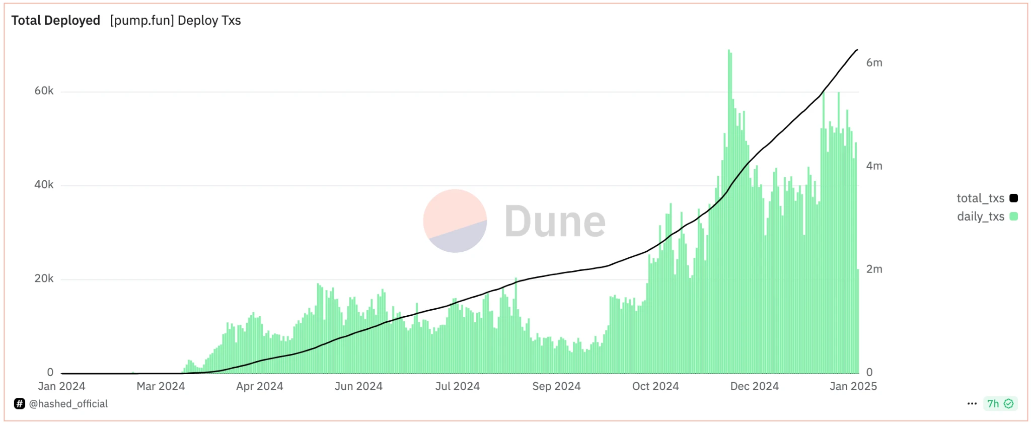 以 Pump.fun 为例,其链上代币 Launchpad 的日发行数量屡创新高。如果说 Hyperliquid 通过链上 Launch 实现百亿美元 FDV 是一场成功的演练,那么更具标志性的事件是 Trump 代币在链上的成功发行。Trump 代币在 24 小时内实现 700 亿美元 FDV,链上流动性高达 7 亿美元,而这一切均发生在链上。更为重要的是,其代币价格受到中心化交易所的影响更小,中心化交易所无法通过获取免费代币来操纵价格。