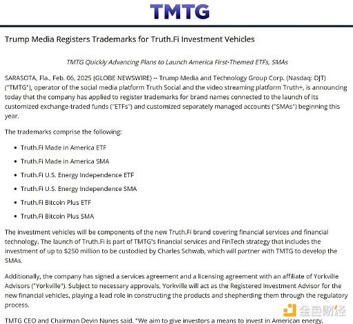 而在上任之后,特朗普家族除了在加密领域“大捞特捞”之外,特朗普家族也在涉入传统金融产业,2月6日,特朗普的社交媒体公司Truth宣布,其已经为旗下定制化ETF产品和单独管理账户产品注册了6个商标,具体的金融产品将在年内推出。从已经推出的几个商标的名字来看,特朗普媒体科技集团大概率会推出美国制造业、能源产业和比特币三个方向的主题产品。这些产品都将归于集团刚刚成立的金融服务品牌Truth.Fi。