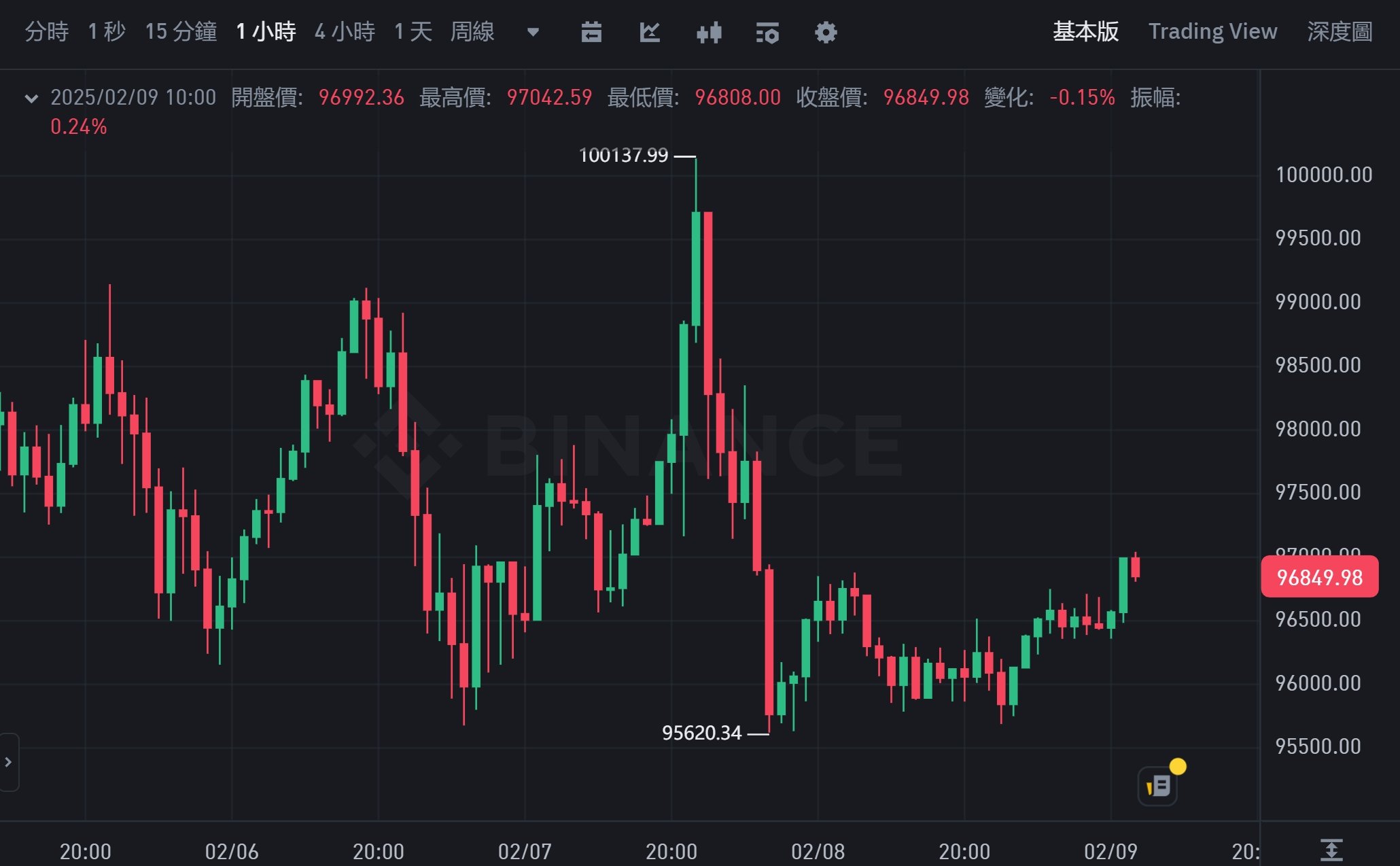 本 月随著美国总统川普频频祭出关税威胁,加密货币市场情绪受到影响,比特币( BTC )在 7 日跌破 10 万美元大关后,近 3 日持续在 9.5 至 9.7 万美元之间震盪,今早一度重返 9.7 万美元,现报 96849 美元,近 24 小时上涨 0.4%。