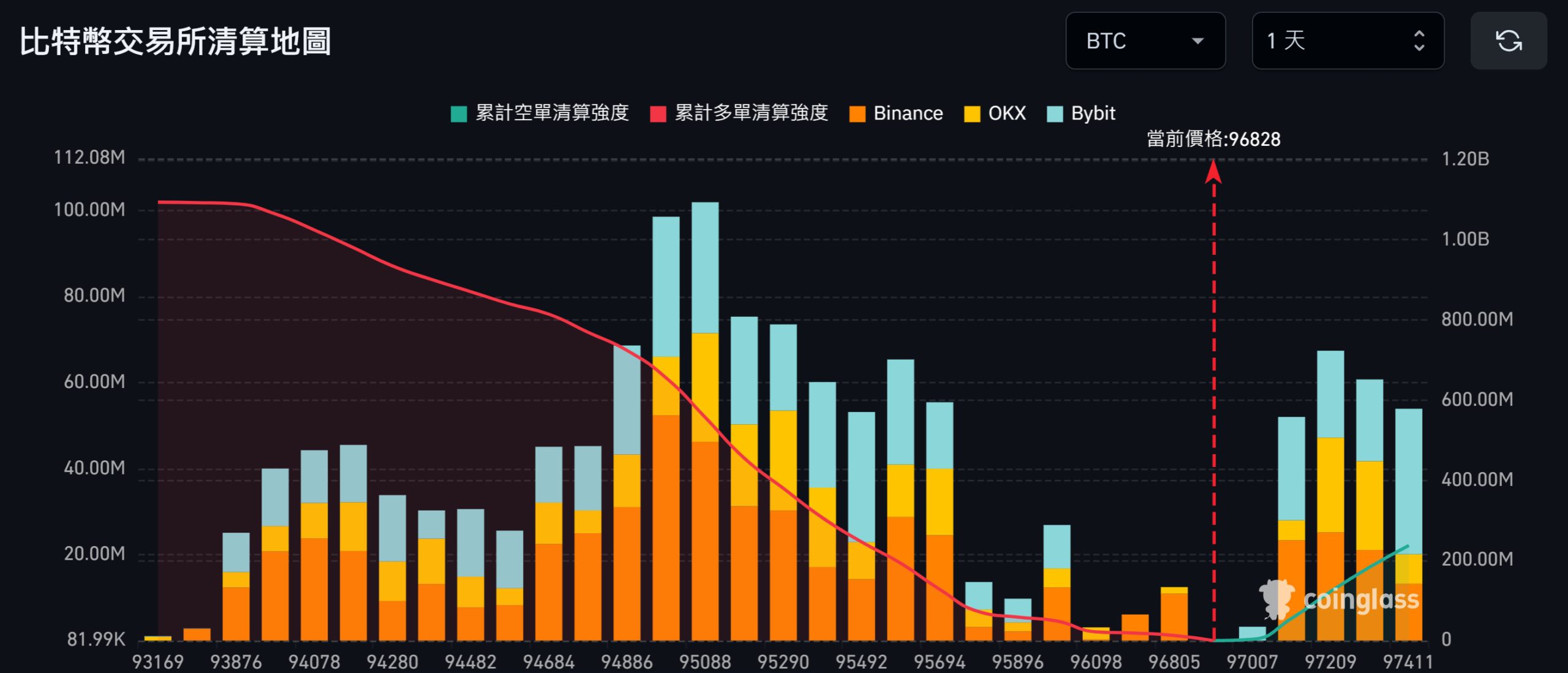 续跌?比特币重返9.7万镁,若掼破9.3万将有超11亿镁清算