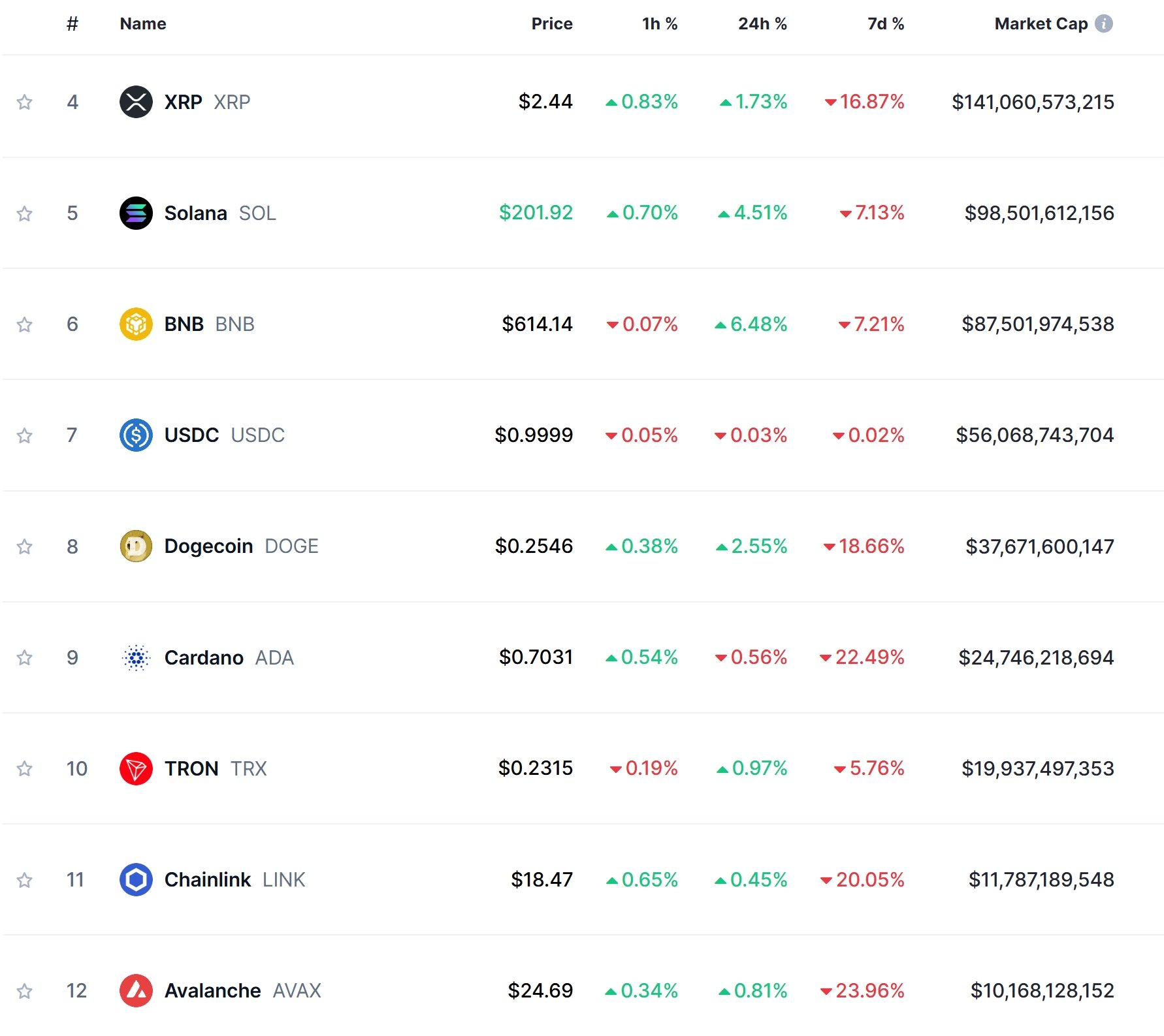 CoinMarketCap 数据 显示,主流币今日普遍小幅上扬,近 24 小时内,SOL 涨幅最为强劲,上扬 4.5% 至 201.92 美元,SUI 也上涨 4.3%, XRP 上涨 1.73%, DOGE 上涨 2.55%,TRX 上涨 0.97% ,LINK 上涨 0.45%,AVAX 上涨 0.81%。