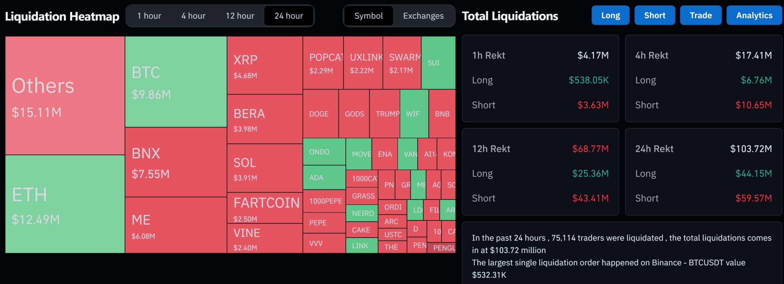 据 Coinglass 数据 显示,过去 24 小时,加密货币全网爆仓金额超过 1.03 亿美元,其中,多头占 4415万美元,空头占 5957 亿美元,有超过 7.5 万人遭清算,不过爆仓额已回归正常,较 3 日 大跌 时的超过 20 亿美元爆仓额显著下降。