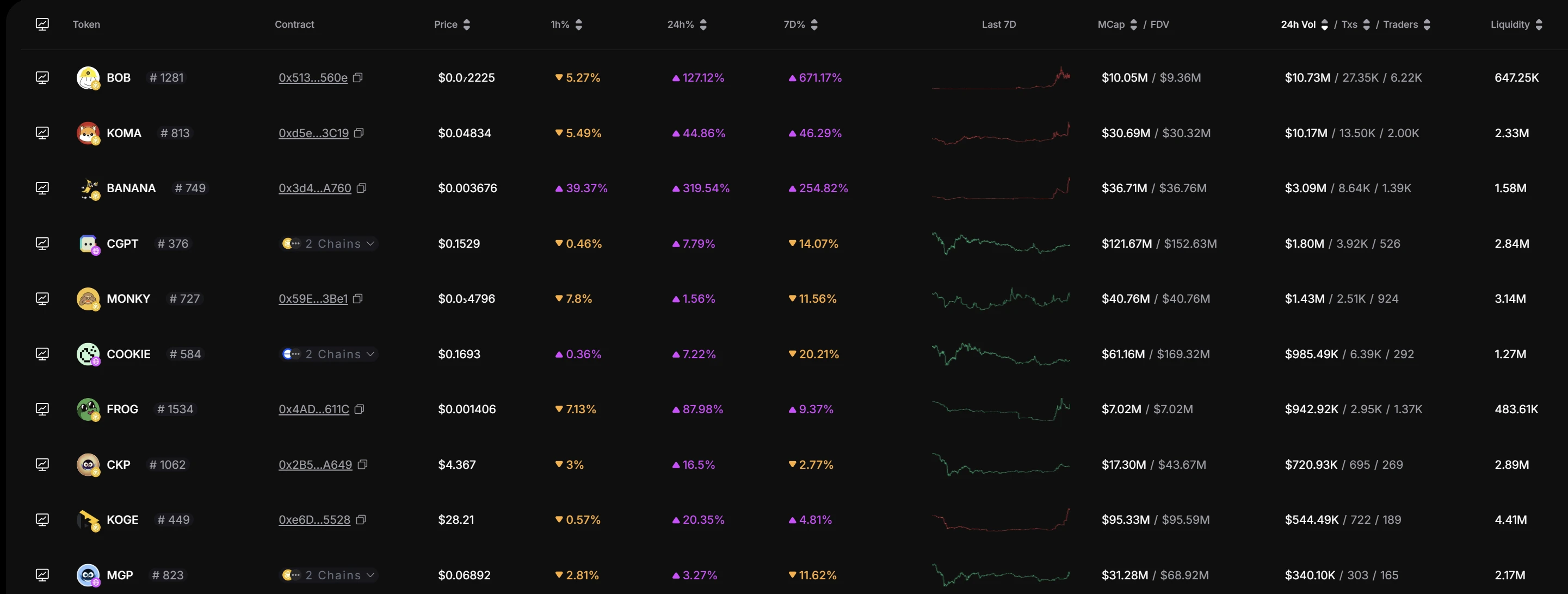币安 Alpha 中的 BSC 代币按照 24 小时交易量排名前十如上图所示,其中前五名分别为: