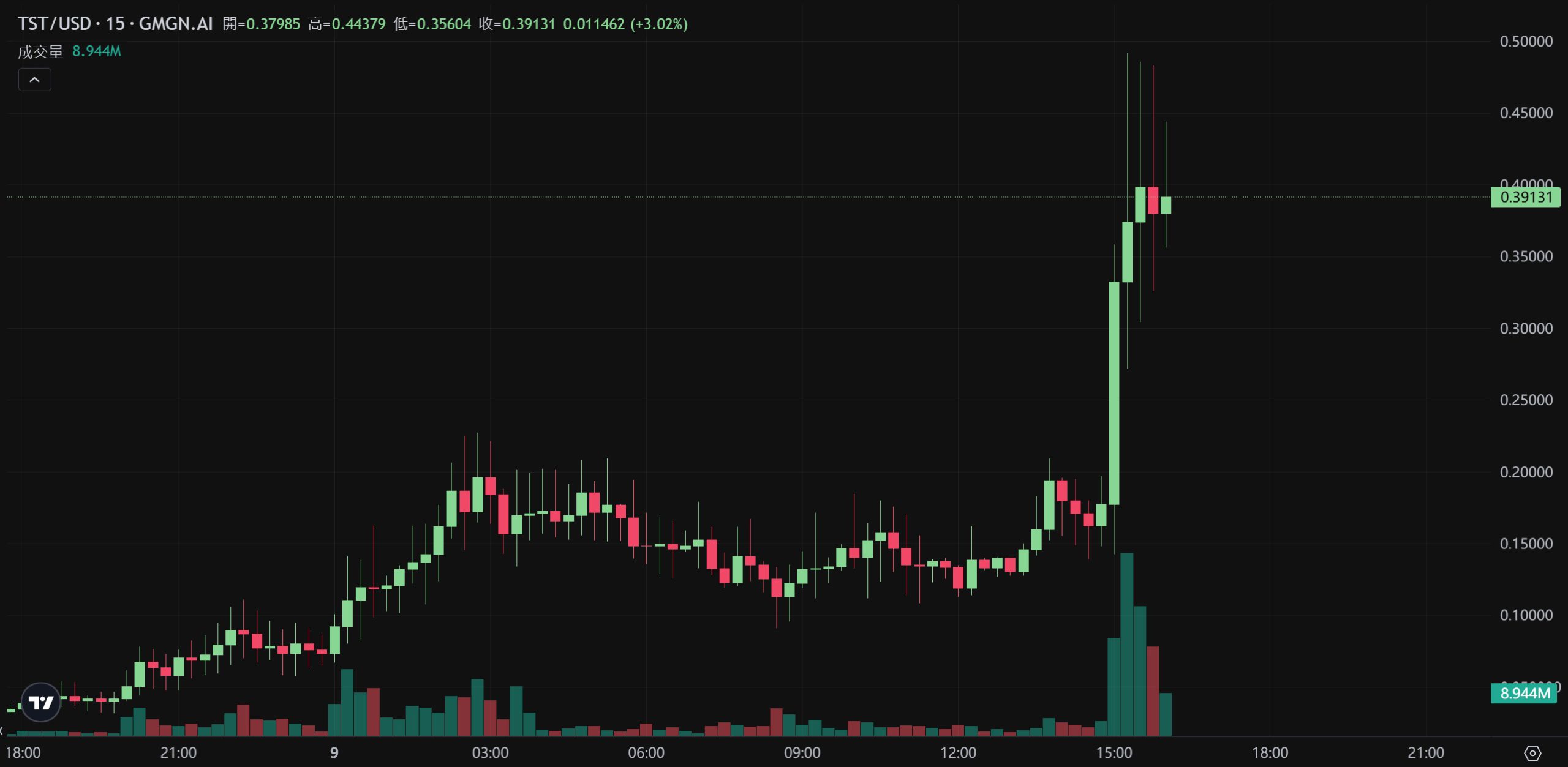 GMGN 数据 显示 ,在昨晚 Binance Alpha 上缐 TST 的消息传出后,TST 最高拉升至 0.227 美元,随后迎来大幅回落,最深在今早 9 时下探至 0.091 美元,不过在稍早币安宣布上缐 TST 后,TST 再度出现巨幅拉升,在半小时内飙升超 300%,最高达到 0.491 美元。