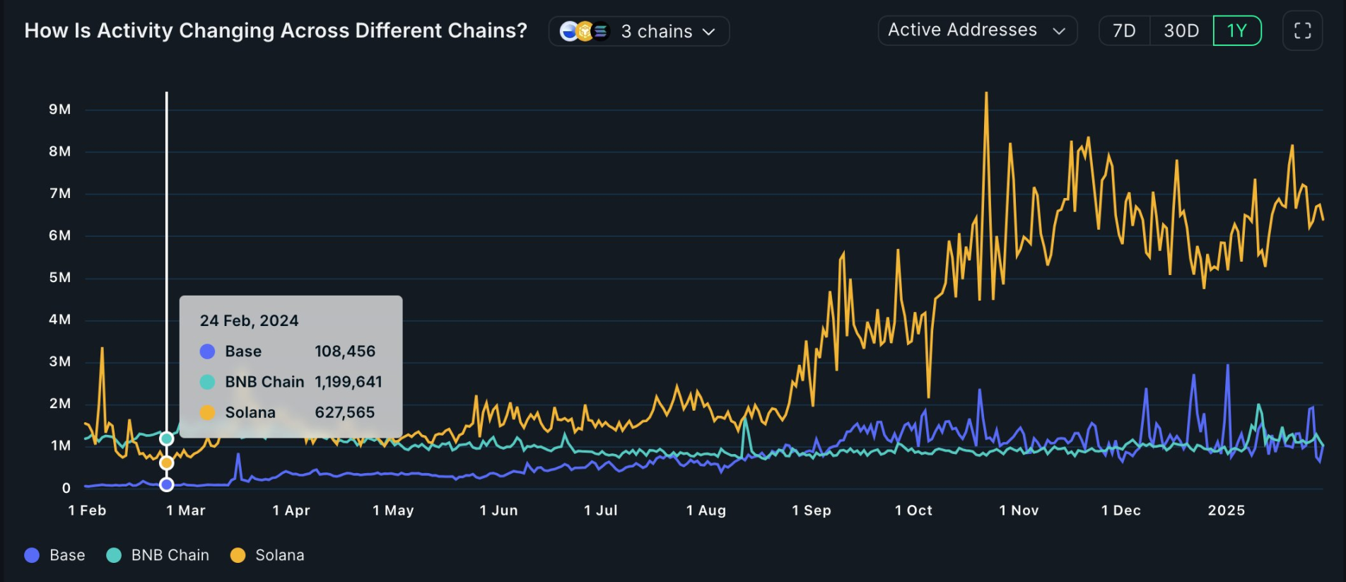 BNB Chain 在上轮上轮周期中有不俗表现,而本轮周期则表现平平,甚至可以说被远远甩在了后面。生态项目表现平平,而 meme 生态也并未起色。相较于 Solana 与 Base 链,趋势明显下滑。截止今年 1 月 30 日,Solana 网络的日活地址数是 BNB Chain 的 6 倍之多,甚至连 L2 新秀 Base 的日活地址数也超越了 BNB Chain,而在大约 1 年前,BNB Chain 的日活地址数是 Solana 的 2 倍。
