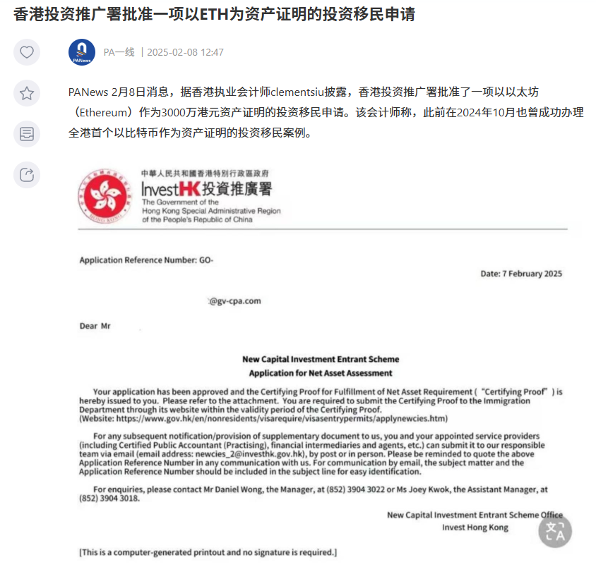 最近香港投资推广署批准了一个“新鲜事”:有人用3000万港币的以太坊(ETH)作为资产证明,成功申请了投资移民。这已经不是第一次了,去年10月还有用比特币“通关”的案例。听起来加密货币玩家似乎找到了一条“捷径”,但实际操作中,很多持币大户却卡在了一个关键环节——资金来源证明(SOF)。今天我们就来聊聊,这到底是怎么回事。