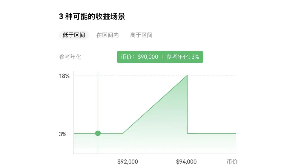 如下图所示,如果到期时标的价格低于9200美元或者高于9400美元,那么你将赚取3%的年化收益,如果标的价格在这两者之间,你将赚取3%~18%之间相匹配的年化收益。