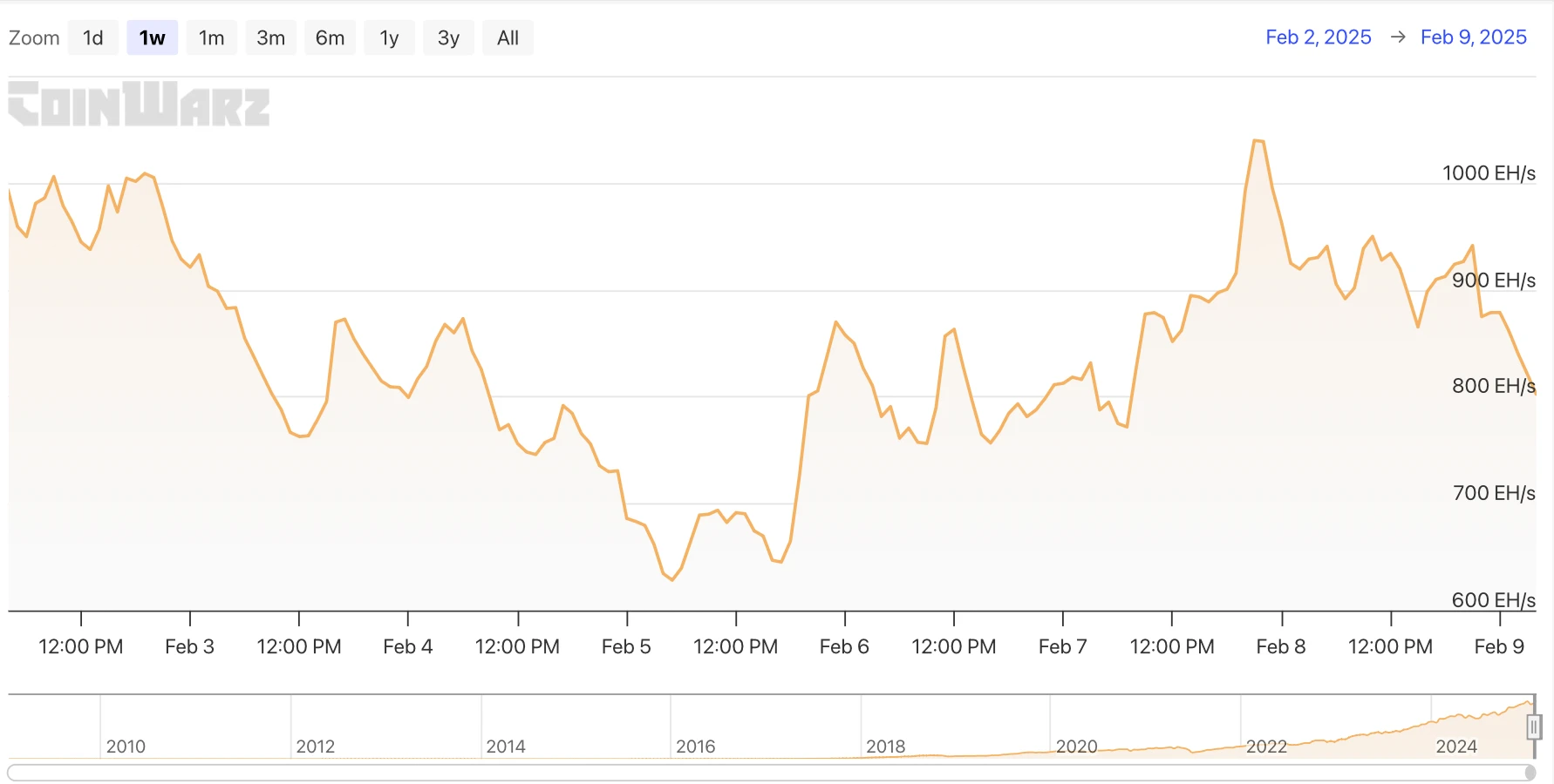 在 2025 年 2 月 3 日至 2 月 9 日期间,比特币网络哈希率呈现显著波动。2 月 3 日,哈希率自前一日高点 1008.72 EH/s 持续回落,最低触及 763.32 EH/s,随后小幅反弹至 872.44 EH/s,整体维持在 760 EH/s 至 870 EH/s 区间震荡。2 月 4 日至 2 月 5 日,哈希率进一步下滑,从 872.91 EH/s 下降至本周最低点 628.16 EH/s。2 月 5 日后,网络算力回升,攀升至 869.78 EH/s。2 月 6 日,哈希率在 750 EH/s 至 870 EH/s 区间波动。2 月 7 日至 2 月 8 日,算力进一步走高,触及本周峰值 1039.65 EH/s,随后回落至 900 EH/s 附近。2 月 9 日,哈希率有所回落,截至撰写时,维持在 800 EH/s 附近。整体来看,哈希率的波动可能受到矿工收益、挖矿难度调整以及市场环境变化等因素的影响。