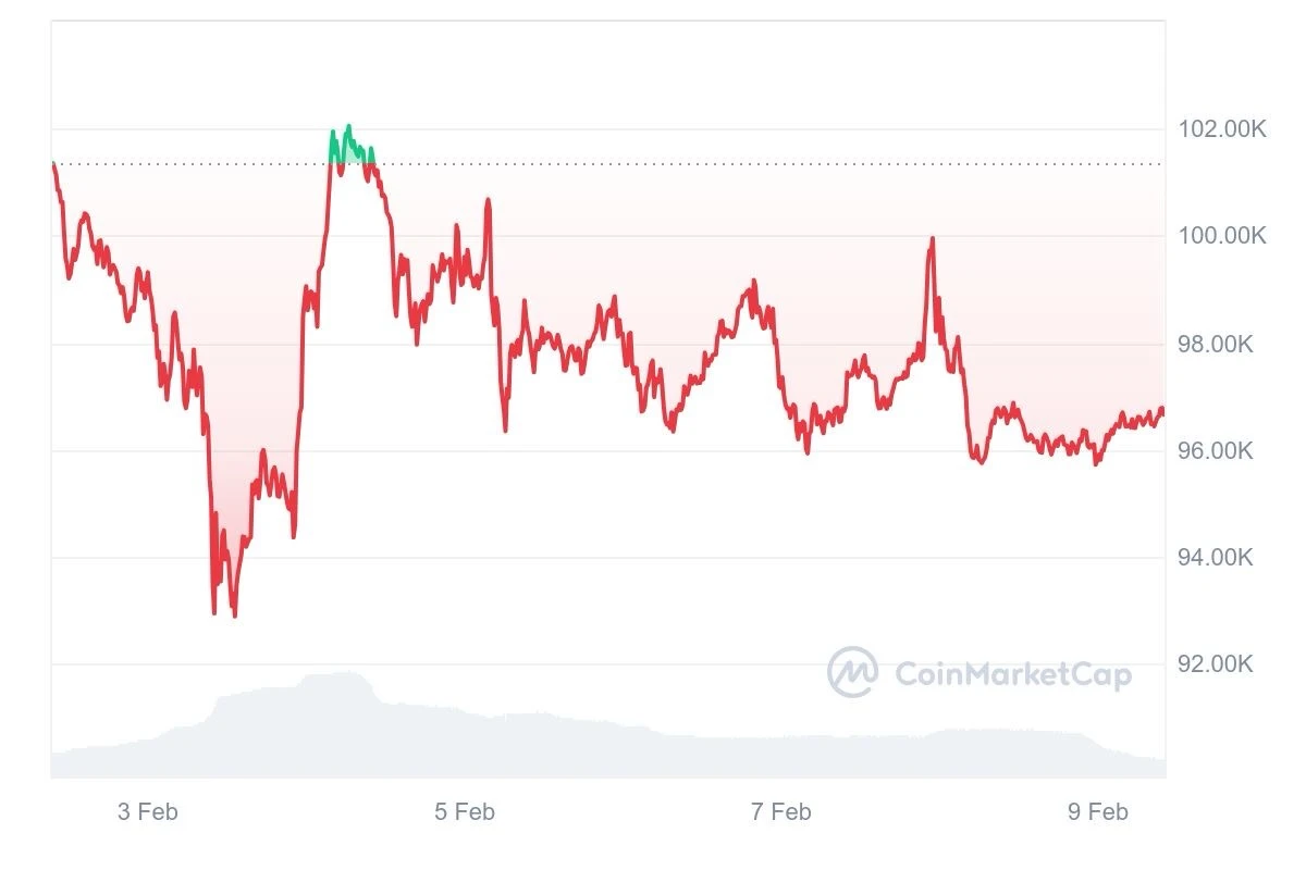 在 2025 年 2 月 3 日至 2 月 9 日期间,比特币价格走势具体表现如下: