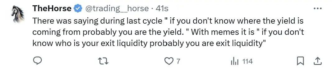 然而,这一轮周期完全不同(是的,确实如此)。市场中充斥着各种叙事和子叙事,每一种都在争夺投资者的注意力,但这些注意力往往转瞬即逝。投资者如今对「抄底」更加谨慎,因为一个币种的整个叙事随时可能崩塌,导致投资变得一文不值。