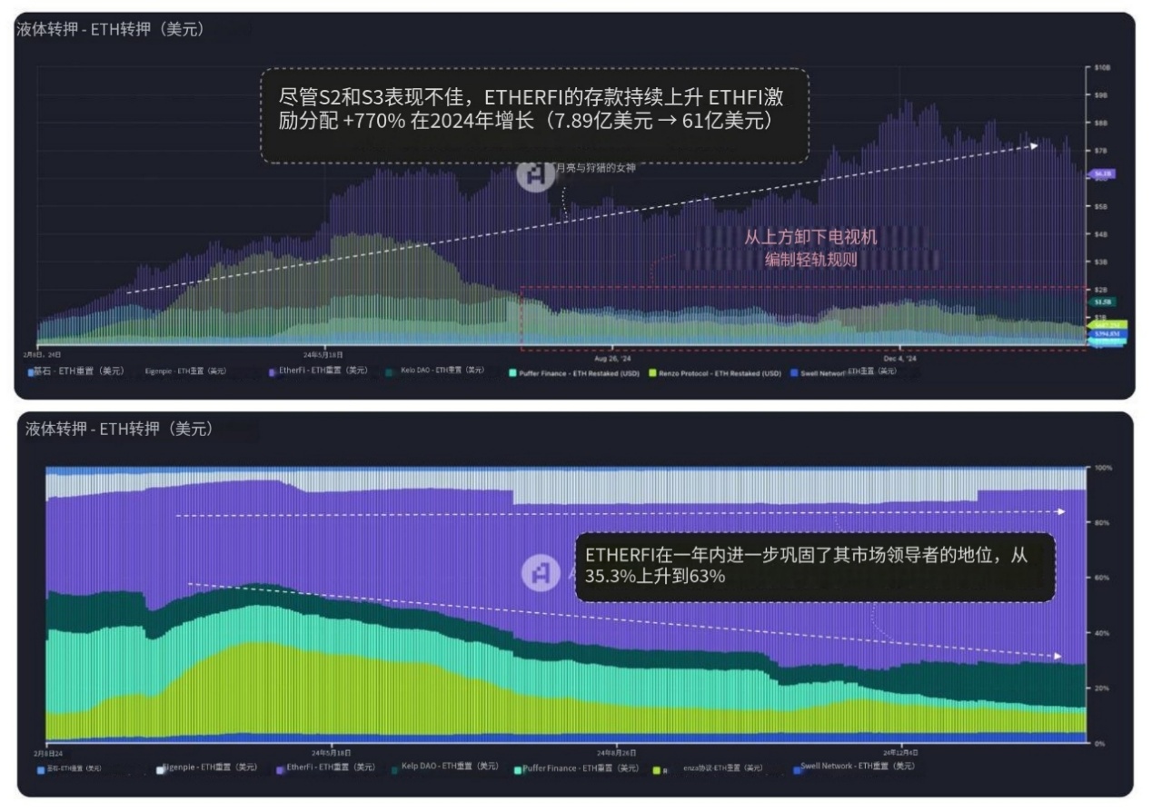 至于流动性再质押,其市场趋势大致相同。值得注意的是,ether.fi 的市场份额从 35.3% 升至 63% 。因为即使 ether.fi 在 S 1 和 S 2 质押量有所下降,其 TVL 在 2024 年还是增长了约 770% 。