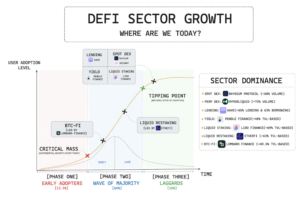 DeFi 的核心是提供更具创新性和效率的系统,通过经过验证的 PMF (市场契合点)解决 TradFi 低效率问题。DeFi 同样由多个关键领域组成,这些领域通常遵循寡头垄断结构。