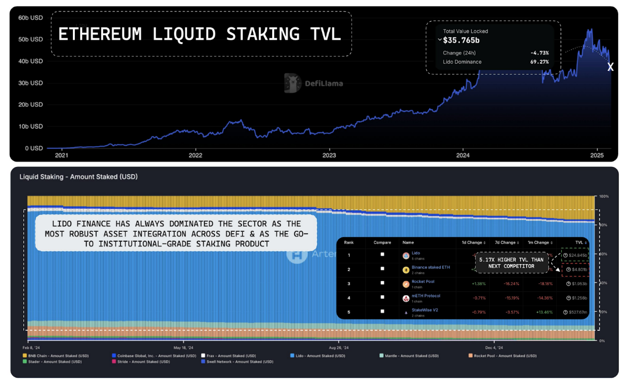 Lido Finance 是无可争议的主导者,市场份额约占 70% ,几乎垄断了 LST 领域,其 TVL(248 亿美元)是其竞争对手 Binance bETH(48 亿美元)的 5.17 倍。