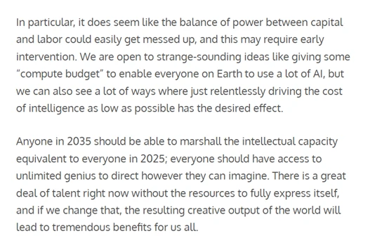 到 2035 年,任何人都应该能够调用相当于 2025 年所有人智力总和的智力能力;每个人都应该能够获得无限的智慧,以他们能够想象的任何方式加以利用。如今,世界上有许多人才没有足够的资源来充分展现自己,如果我们能够改变这一点,世界将创造出巨大的价值,从而为我们所有人带来巨大的好处。