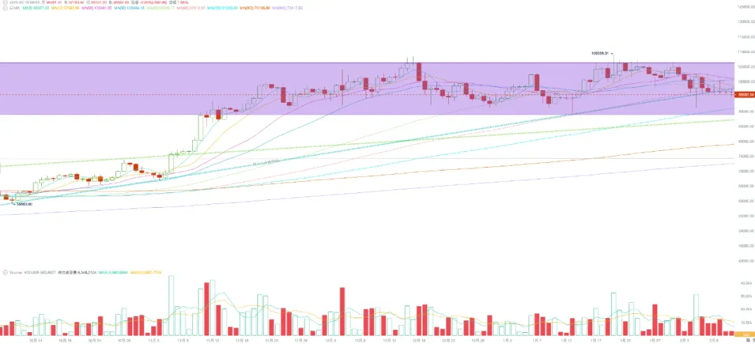 本周 BTC 开于 97676.53 美元,收于 96475.82 美元,全周下跌-1.23% ,最高振幅 11.69% ,再次上攻 9 ~ 10.8 万美元箱体,成交量略有萎缩。