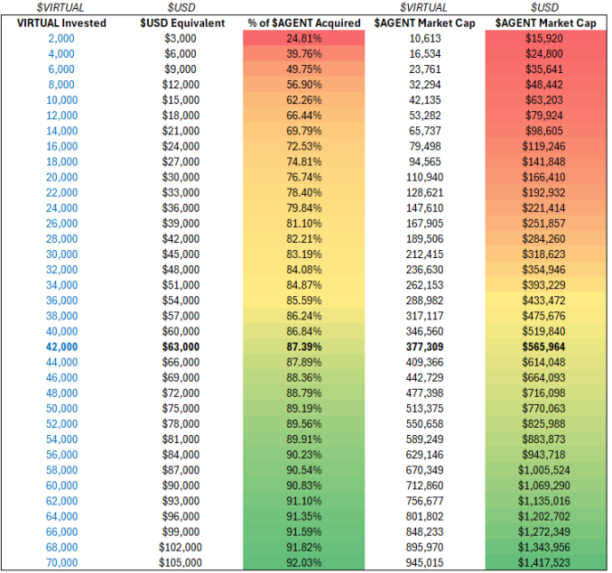 - 42000 VIRTUAL→ 可获得 87.4% 的 AI 代理的代币,初始市值为 377000 VIRTUAL(约 565000 美元)
