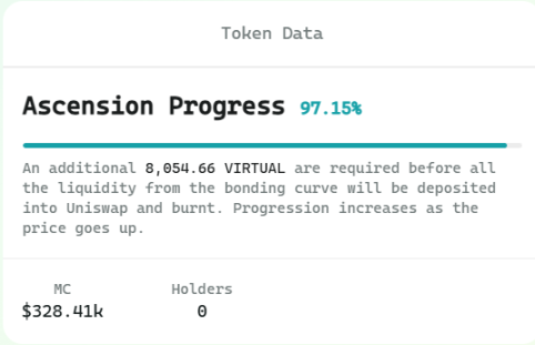 - 2000 VIRTUAL→ 可获得 24.8% 的 AI 代理的代币,初始市值为 10600 VIRTUAL(约 16000 美元)