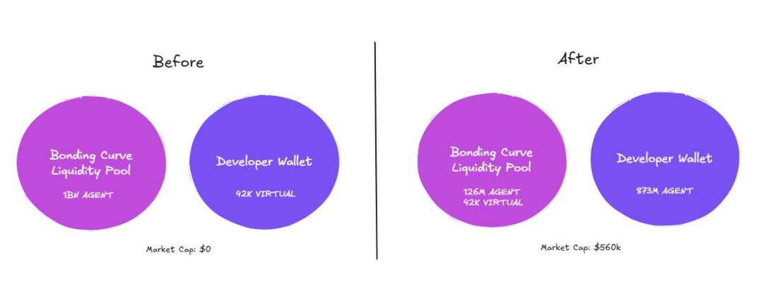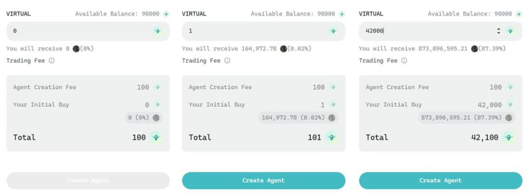 鉴于在典型的 Web3 领域中,团队和金库控制的代币总百分比约为 90%,并且在 Virtuals 平台上推出 AI 代理的团队通常致力于在数年时间内打造一个价值 10 亿美元的代币,因此团队在首次购买交易中获取 40% 至 90% 的代币供应量是可以接受的。