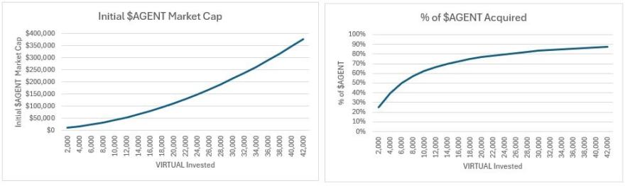 随着投入的 VIRTUAL 代币数量增加,每投入一单位 VIRTUAL 代币所获得的边际 AI 代理代币供应量会减少,如下图左侧图表所示。仅从这张图表来看,从 bonding 曲线优化的角度,团队似乎应尽可能少地获取初始供应量。
