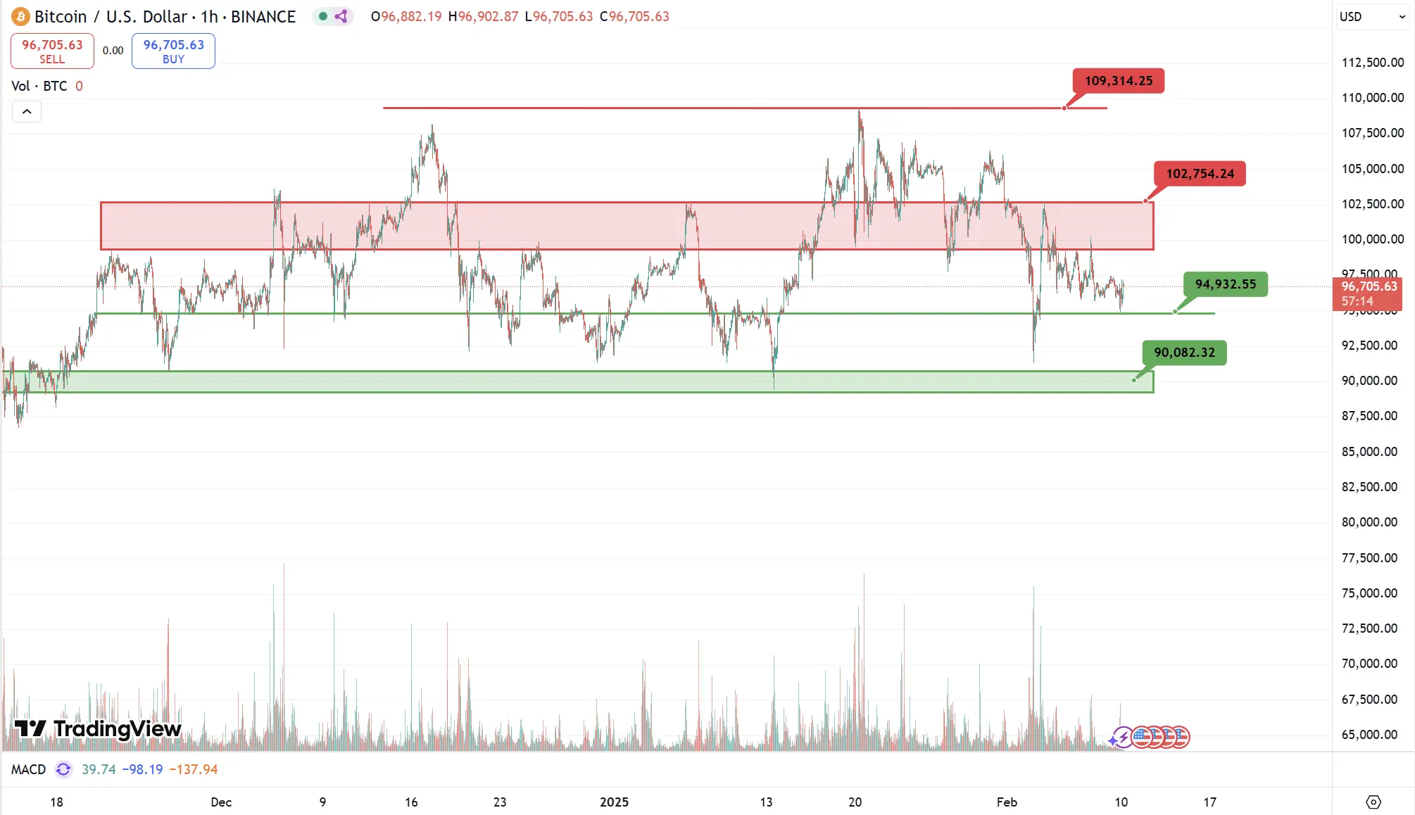 过去两周,比特币继续“强下跌伴随弱反弹”的态势,看起来似乎走势羸弱,但仔细分析也不过是小周期级别的下跌,一旦将周期拉长至日线级别及以上,便可发现现阶段仍然处于9万美元~11万美元的宽幅盘整区间,所以在有效跌破9万美元底部之前,我们仍处于上涨的盘整阶段,提及熊市尚早,因此对于现货用户可在上述提及的跌破信号出现之前继续持有,而对于合约用户来讲,重点关注图中标识的几个关键支撑阻力区域来进行操作,鉴于小周期级别的趋势不具备延续性,因此提醒用户尽量减少持有隔夜单的频率.
