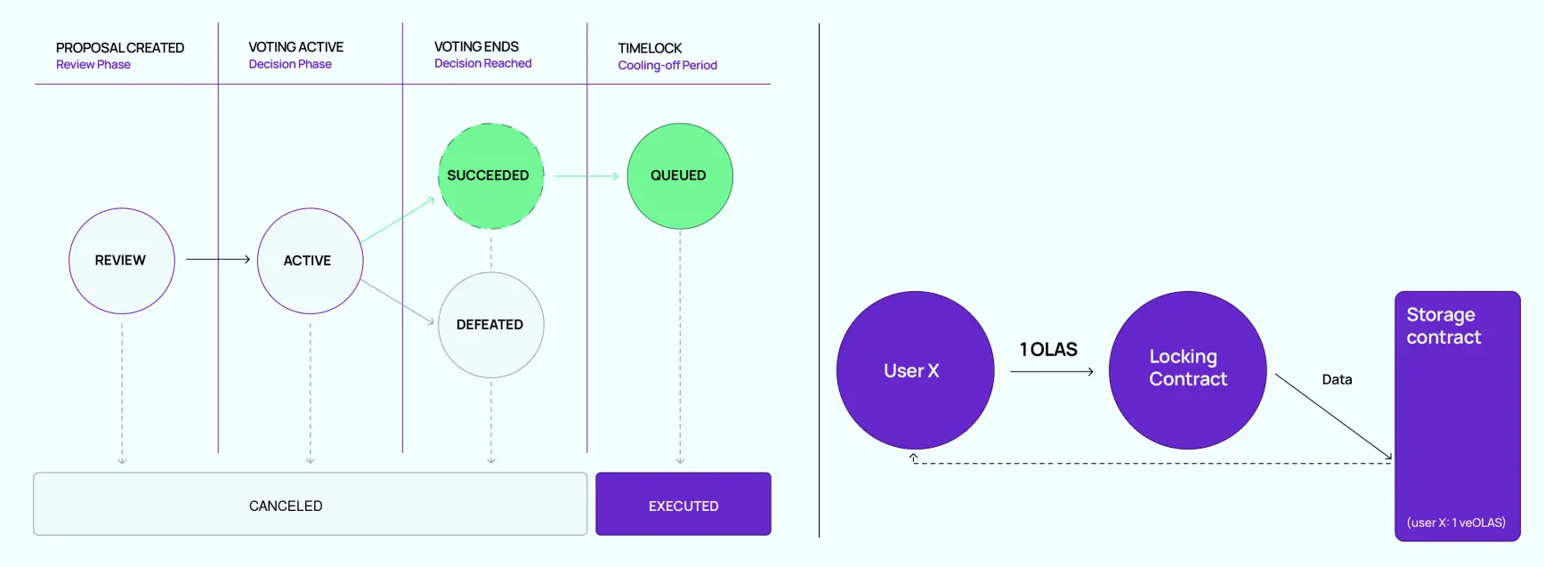 最初,持有虚拟化的 veOLAS 代币的用户可以参与任何治理活动。 veOLAS 代币通过锁定 OLAS (Autonolas的原生代币)获得。治理参与程度与veOLAS的持有量和锁定时间成比例。