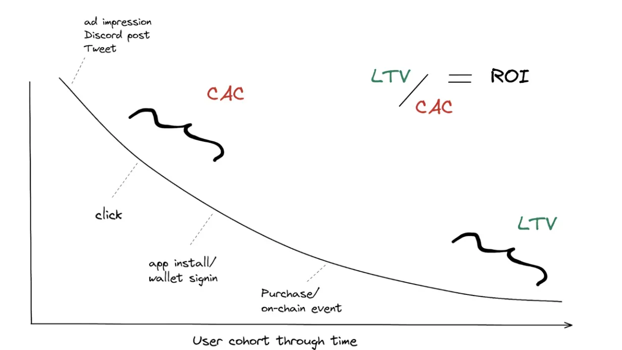 在其纯粹和完美的形式中,归因让你能够衡量所谓的营销“漏斗”:一群逐步从Discord帖子到点击、到钱包登录,再到某个链上(或链外)用户行为的用户。如果你知道自己如何在应用体验中实现“漏斗下游”的货币化,并且知道为将用户带到这个位置花费了多少(无论是通过付费媒体如广告,还是通过自然流量如博客文章),那么你就可以计算你的“ROAS”(广告支出回报率......营销技术有很多缩略语)。理想情况下,它看起来像这样: