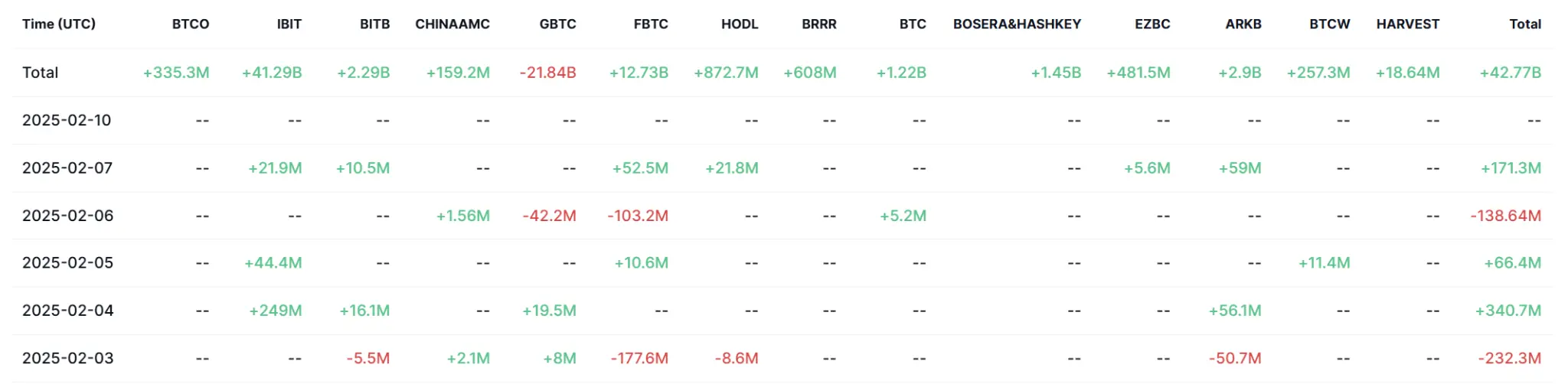 上周交易日(2月 3日至 2月 7 日) 美国比特币现货 ETF 累计净流入 3.186亿美元,具体机构买卖情况如下