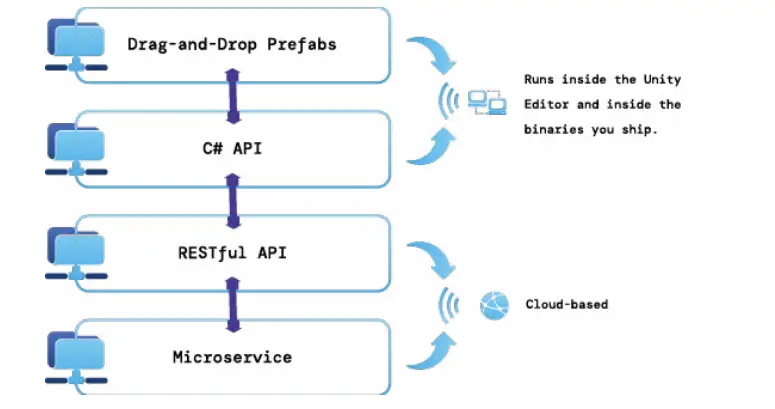 Beamable的中继服务器以可承受的成本解决了P2P的原始问题。它们与客户端/主机拓扑结构兼容,并且通常通过可靠的 UDP 协议或(TCP)WebSocket 实时在客户端对等体之间传输数据,无需服务器端模拟。客户端负责对数据包进行排序、处理和插值,以生成连贯的模拟。同时Beamable 提供了一种应用服务器技术,该技术以无服务器的方式部署,并被划分为微服务,这些微服务能够独立扩展、版本化、可调试,并且易于集成到 Unity 编辑器的工作流程中。