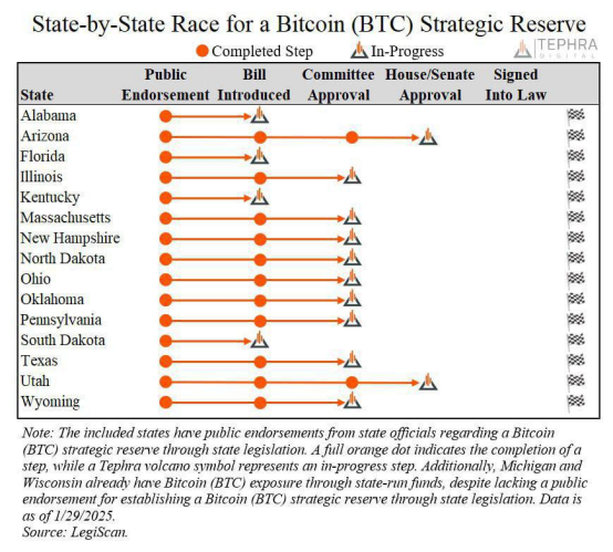 除了美国高层,各大州也率先开启了比特币战略储备的申请,包括阿拉巴马州、亚利桑那州、佛罗里达州等在内的15个州目前已发起比特币战略储备相关计划,亚利桑那州及犹他州进度已过渡至两院批准阶段,距离获批成法律仅剩一步之遥。