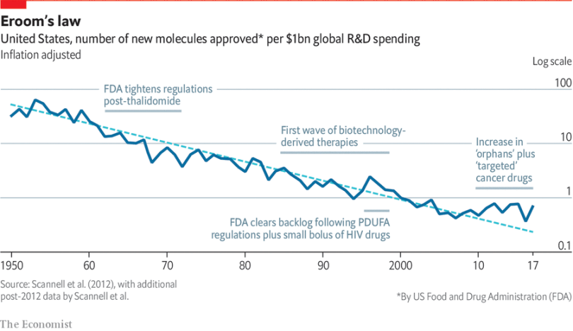 在最近 Tarun Chitra 和 benjels 的 DeSci 辩论中,制药创新停滞的问题被提出,并引用了 Eroom 法则(摩尔定律的反面)。