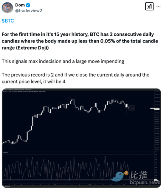 DOM 表示:「在比特币 15 年的历史中,首次出现了连续三根‘极端十字星’蜡烛图,每根蜡烛的实体部分仅占整个蜡烛范围的不到 0.05%。这标志着市场极度犹豫不决,预示着即将出现大幅波动。」