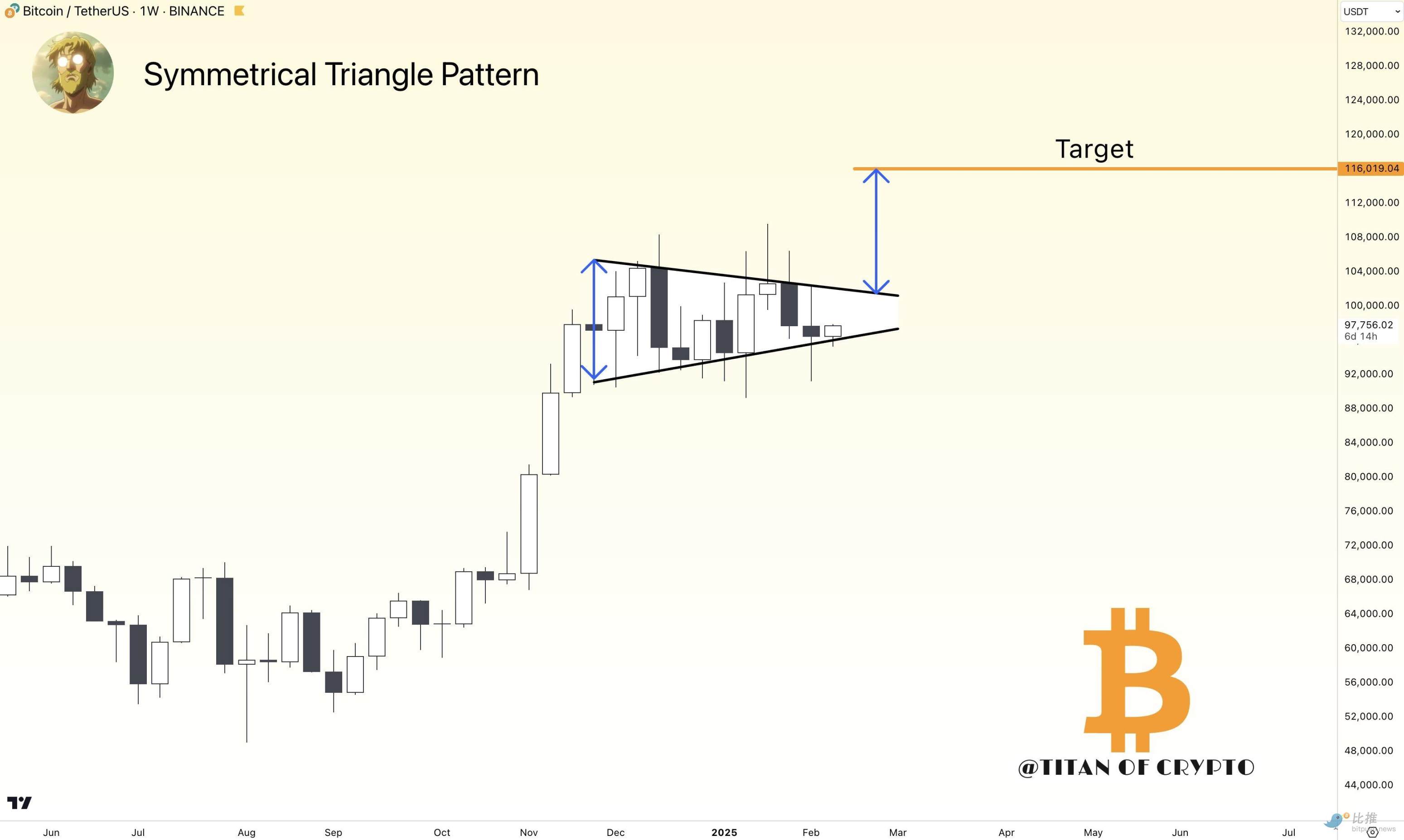 市场分析师 Titan of Crypto 指出,比特币价格有望突破三角形的上趋势线,并最终达到 116,000 美元的目标位。根据技术分析规则,上涨目标位的计算方式是将三角形上下趋势线之间的最大距离与潜在突破点相加,这一方法为比特币的上涨目标提供了理论依据。