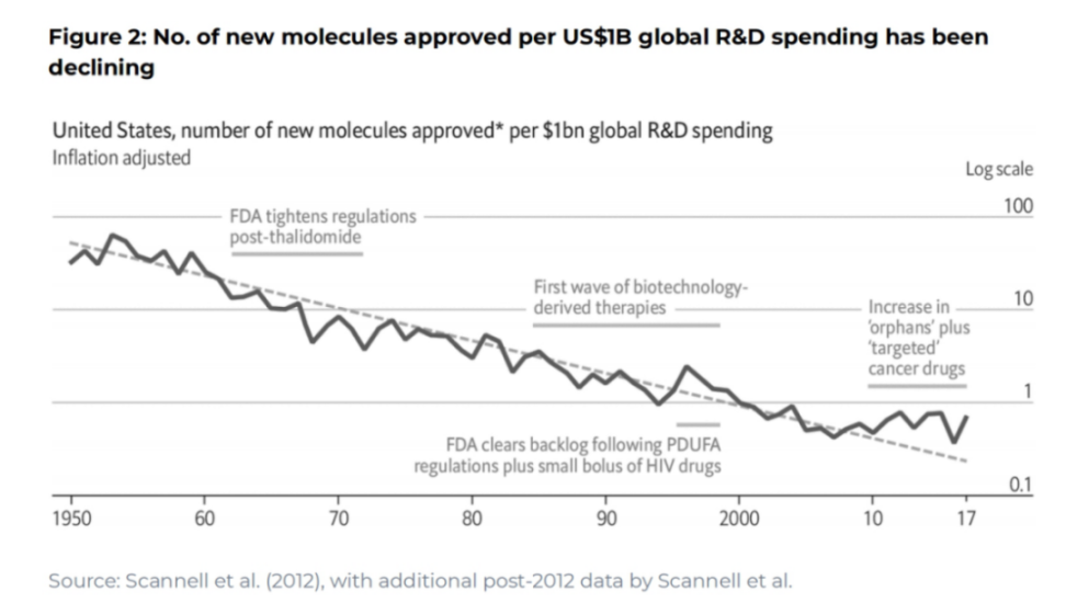加剧这些挑战的是药物研发过程中日益低效的研发流程。在美国,开发和批准一种新药的成本大约每九年翻一番——这一现象被称为 Eroom 定律,是摩尔定律的反面。一些原因可能是更严格的监管标准、新医学发现满足与现有药物不同需求的门槛高,以及设计和运行临床试验的合同研究组织的成本高昂。如果这种现状继续下去,到 2043 年,生物制药行业开发一种药物的成本可能高达 160 亿美元。这种财务负担往往导致该行业专注于开发利润更高的药物,而这往往会掩盖解决其他关键健康需求的紧迫性。