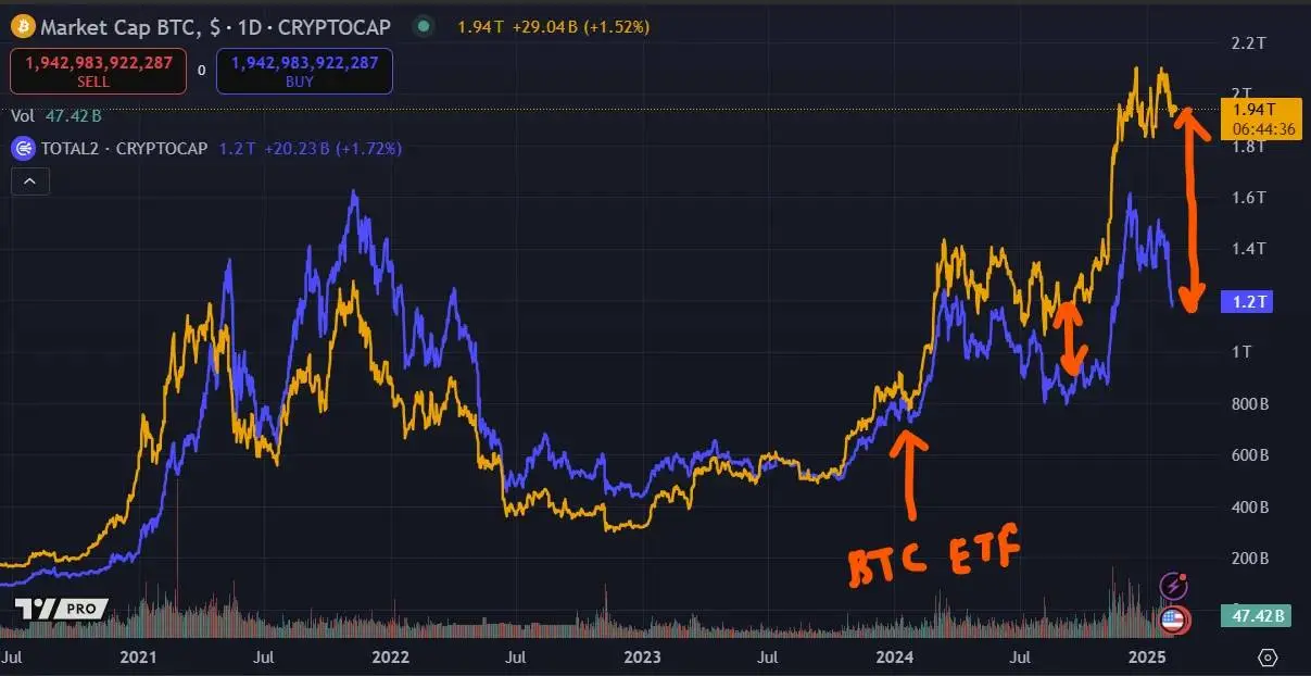 每个人都在期待“山寨季”的到来(即蓝线超过橙线的时刻),就像 2021-2022 年那样,所有山寨的价格都呈现爆炸式增长。然而,自 2024 年 1 月比特币 ETF 推出以来,比特币 (BTC) 与 TOTAL2 指数(代表山寨总市值)的差距却在不断扩大。