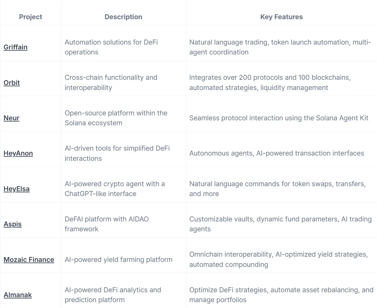 以下是8个DeFAI项目的列表(按顺序排列),附带简短描述及其一些关键功能。