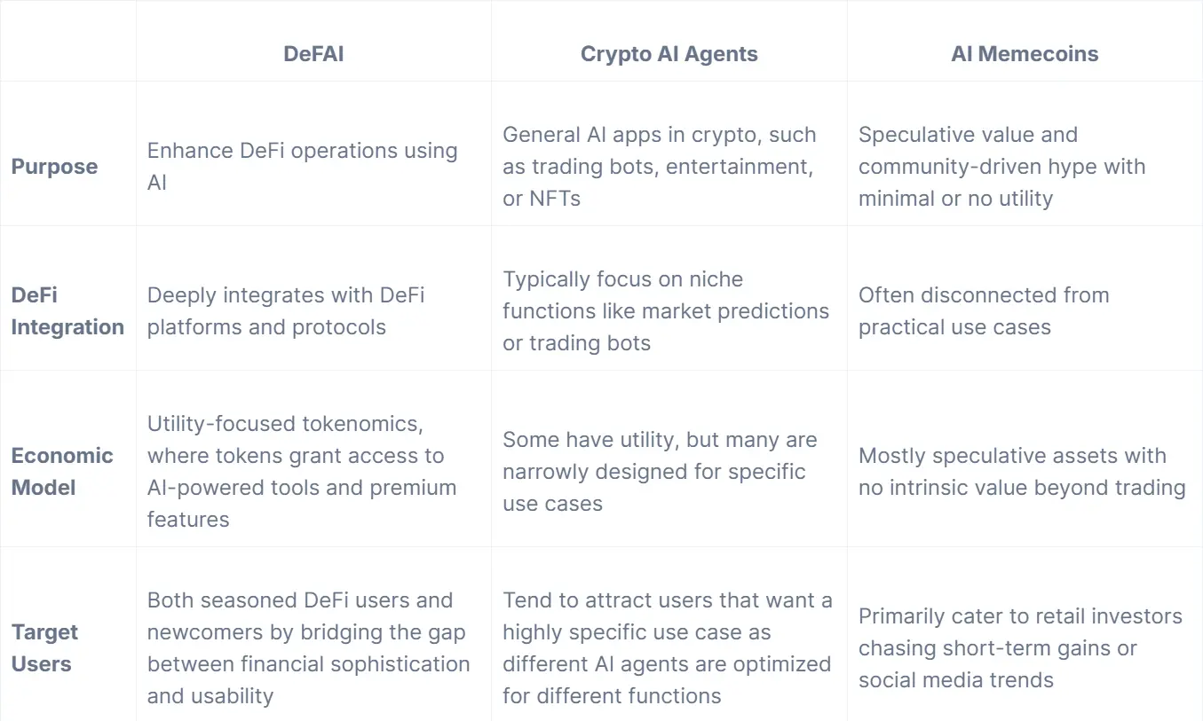 AI Meme币通常依赖于炒作而没有实质性的功能;加密AI代理项目通常针对特定的应用场景;而 DeFAI 则采取让链上金融生态系统对大众更具可访问性的方式。